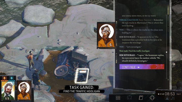 On this page of the Disco Elysium guide, you will find a detailed walkthrough of the Find the traffic hooligan side quest. In our walkthrough, we explain how to analyze the scene of the accident as well as how to correctly examine the destroyed vehicle stuck in the ice, in the western part of the map.