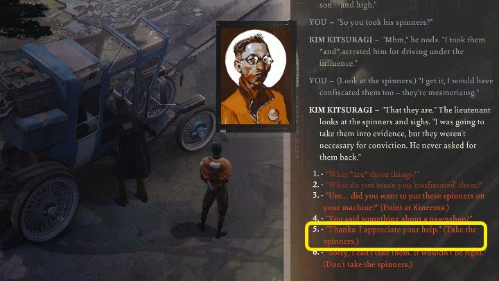 He will offer to help and say that he owns the item Radiant Spinners, which can be sold to get money to pay off the debt. Go to Kim's car, search it and take the valuable item.