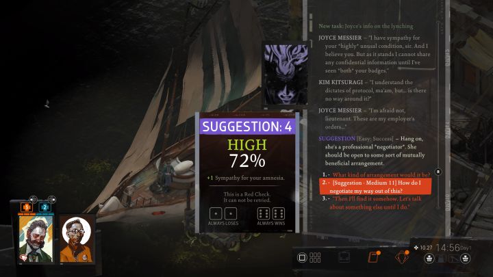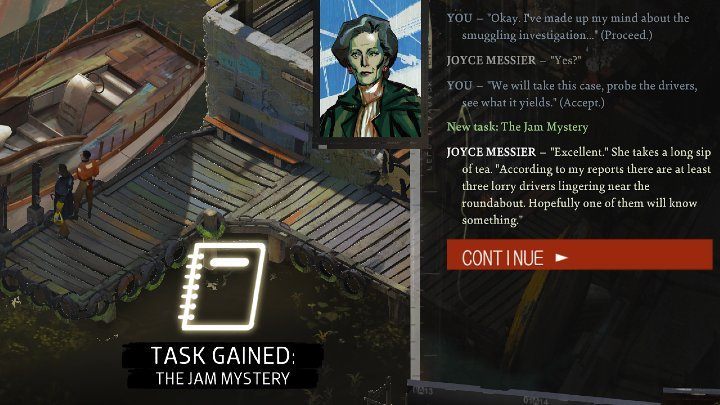 To start with the investigation, you need to meet with Joyce on her yacht - you can find it docked west from the apartment building. During the conversation, a Suggestion skill check will appear that you can take.