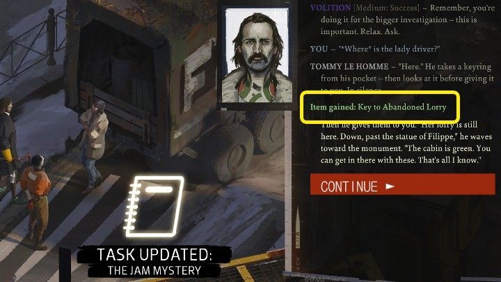 On this page of our Disco Elysium guide, you can find a detailed walkthrough for The Jam Mystery side quest. Here we show how to start this side quest, the locations of the drivers you need to question, how to lean on trader Siileng, and finally how to get access to the FALN lorry.