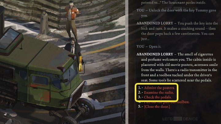 - Getting the location of the lorry - you can force Racist Lorry Driver (the one before Frittte) to reveal the location of the needed lorry. The second option is possible only if you complete a difficult Half Light skill check - the task can be easier if it is Kim who leads the conversation.