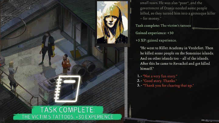 On this page of the Disco Elysium guide, you will find a detailed walkthrough of The victim's tattoos task. It involves discovering the history of a murdered man's tattoo. It's the man who was hanged in the backyard of the Whirling-In-Rags hostel. In the walkthrough, we explain how to take photos of the victim's tattoos, who to talk to about tattoos, and how to find out what they mean.