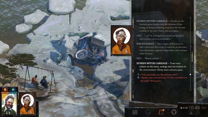 After roughly two hours, the low tide will come - Harry and Kim will be able to search the wreckage of the vehicle (Well, at least I can see what's in there now option). Inside, you will find the lost badge and one item of clothing.