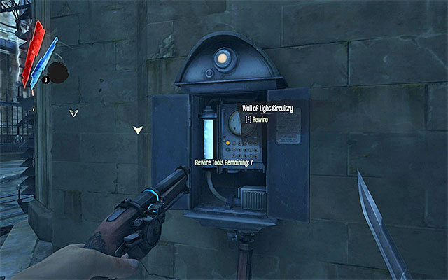 A less obvious thing to do is to hack the control panel, to the right of the wall, using a rewire tool . The action modifies the operation of the wall in such a way, that it now lets Corvo through and kills enemies that try to get through it.
