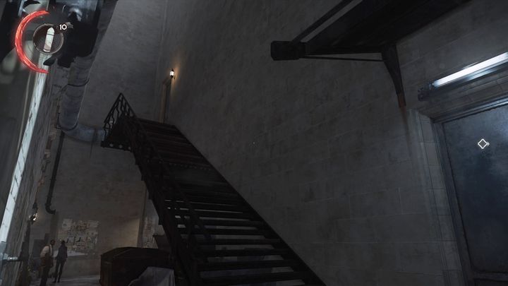 Once you explore the said building, go to the street and start moving further into Dunwall. The moment shown on the screenshot allows acquiring a map, which hangs on the wall to the right. If you don't want to kill the guards, the only method of getting the map is sneaking through the lower right canal, and using a small passage which is seen on the screenshot. Map will hang on the opposite wall.