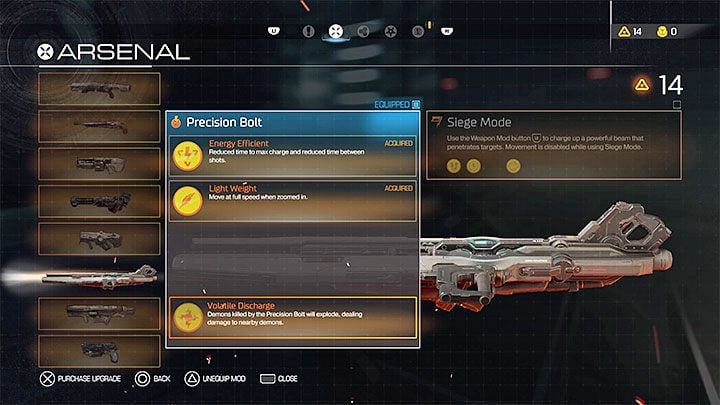 - Every weapon in Doom has one or two modifications - for example, Gauss Cannon has Precision Bolt and Siege Mode (presented in the picture above). Unlock new modifications by finding Field Drones.