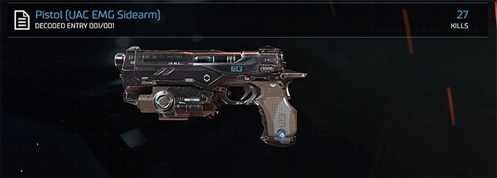 UAC EMG Pistol is the weakest weapon in Doom. This is your starting gun. The Doom Marine gets his hands on a much more powerful Shotgun after a few minutes into the game but this doesn't make the Pistol useless. You can still use it to attack weaker demons. However, you should remember to use charged shots because they deal more damage than the regular fire mode. The Pistol's unique feature is that it has unlimited ammo.