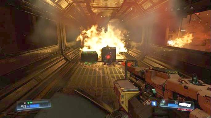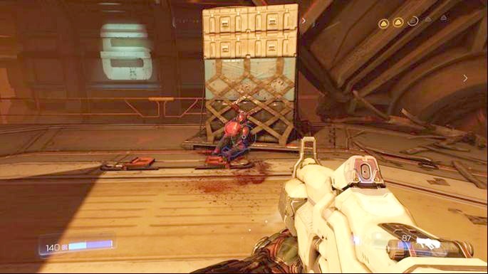Further path from the combat drone leads through the door below. Once you're behind the door, first go to the left. Pick up the armor, kill the demon and then jump on the sidewalk ahead of the armor.