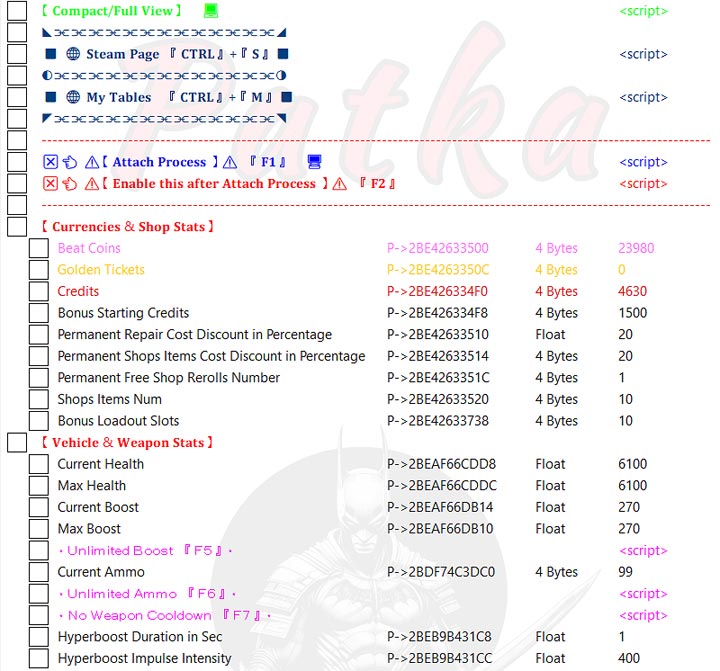 Cheat Table is a script for Cheat Engine to be used in Carmageddon: Rogue Shift. It was created by patka.