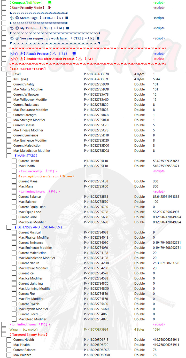 Cheat Table is a script for Cheat Engine to be used in Kristala. It was created by patka.