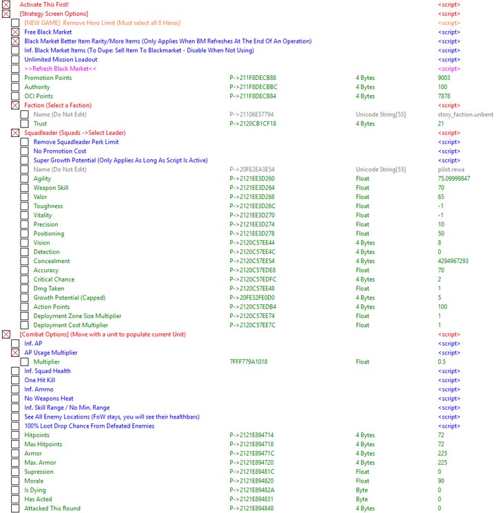 Cheat Table is a script for Cheat Engine to be used in Menace. It was created by eggs.