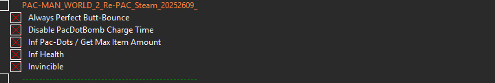 Cheat Table is a script for Cheat Engine to be used in PAC-MAN WORLD 2 Re-PAC. It was created by MBRKiNG.