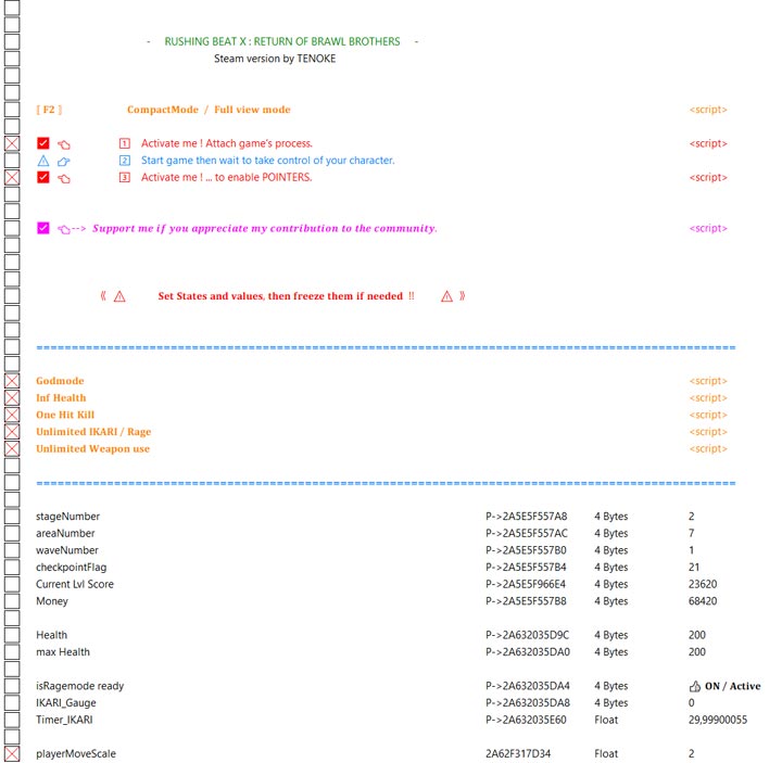 Cheat Table is a script for Cheat Engine to be used in RUSHING BEAT X: Return Of Brawl Brothers. It was created by LIOBOSS.