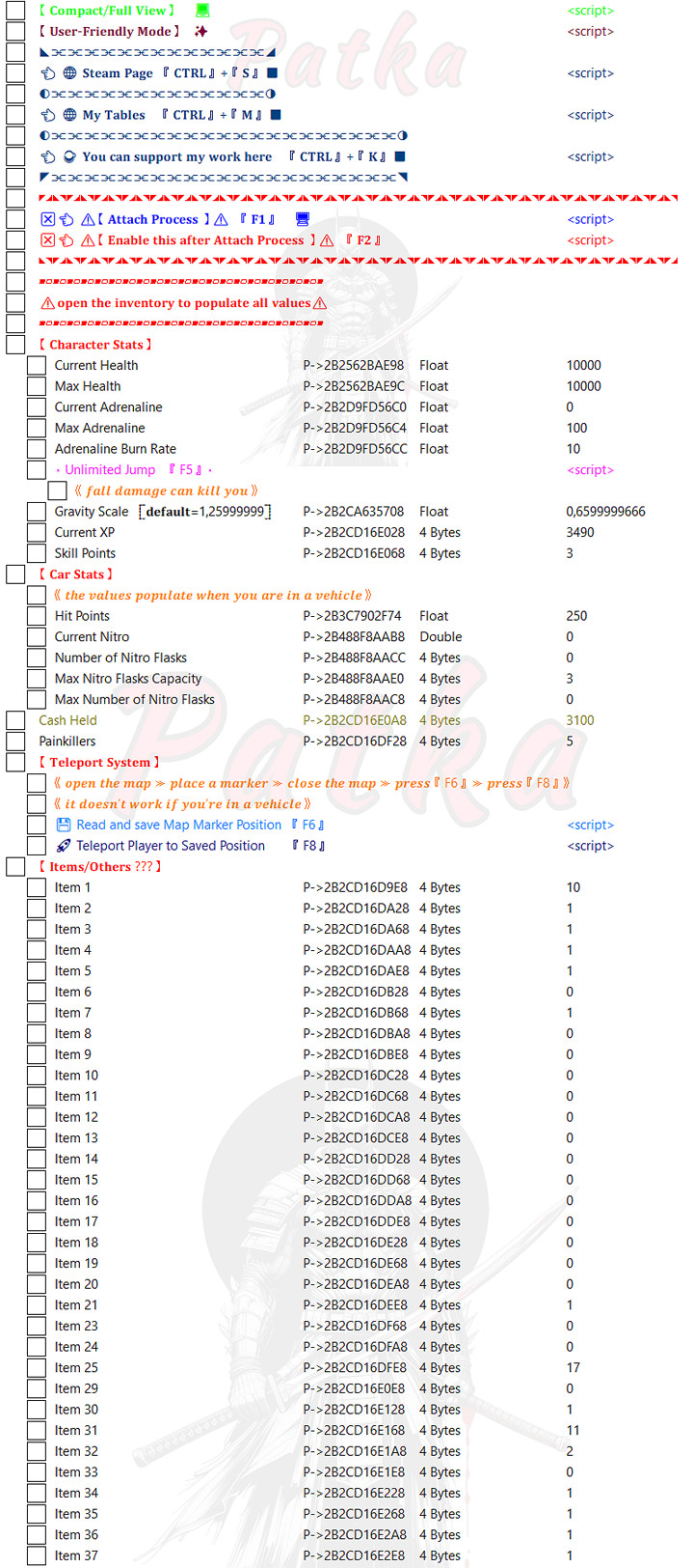 Cheat Table is a script for Cheat Engine to be used in Samson. It was created by Patka.