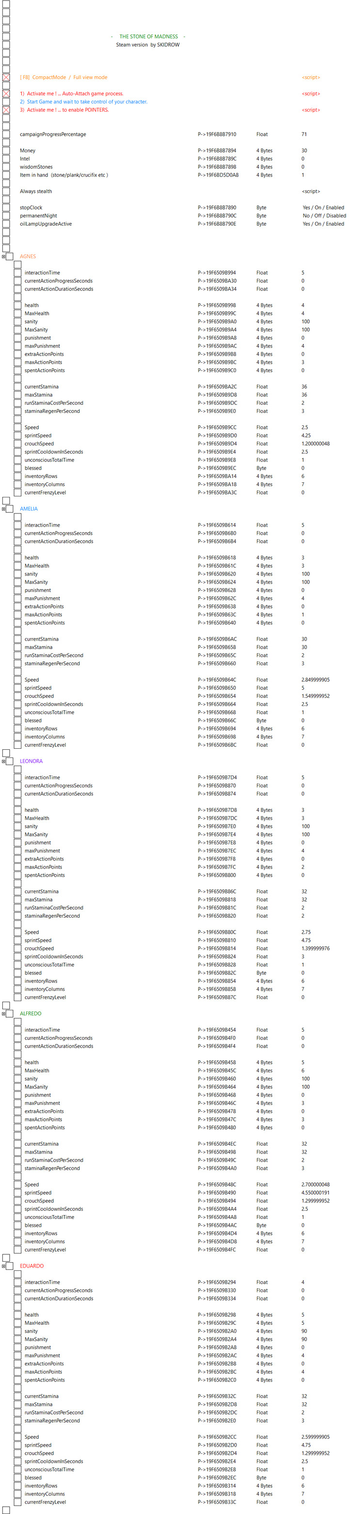 Cheat Table is a script for Cheat Engine to be used in The Stone of Madness. It was created by LIOBOSS.