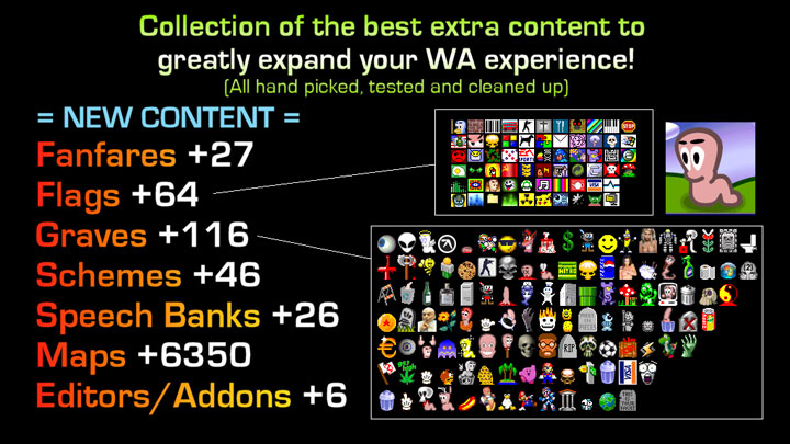 Worms Armageddon Extras Megapack is a mod for Worms Armageddon, created by Reactorcore..