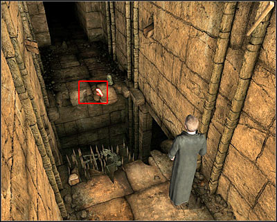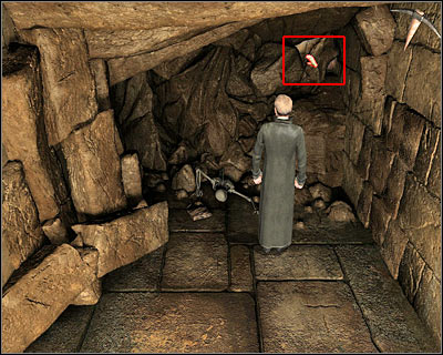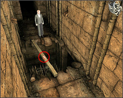 You'll end up standing inside a small dark room. There are some interactive objects here and it'll be up to you to collect them. Take a Plank, a Turban and a Pick head. You can also take a closer look at the skeleton and the blocked exit, however it's option. Proceed to the bottom of the screen and start moving towards a new corridor. You'll end up standing near a trap. Listen to what Van Helsing has to say about your current situation.
