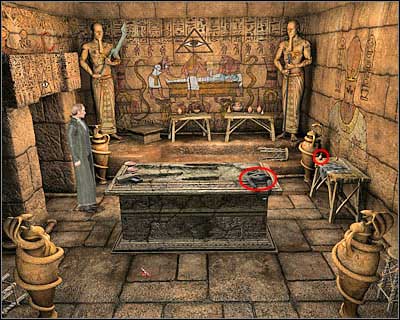Go back to the junction. It won't come as a surprise to you that you will have to explore the right corridor. You'll end up inside an interesting room where bodies were prepared for mummification. Look at the signs above the door and examine the painting seen in the background. Now you will have to collect a few times. Pick up some Linen stripes, as well as a Flask of oil. Once this is done, go back to the corridor with the hole in the ground.