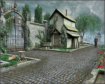 Go back to the gravedigger and try talking to him again. You'll find out that he doesn't need the shovel anymore, so you may as well keep it. Ask him a few other questions, concerning the Godalming Manor, the Other Entrance and the Watchman. You'll find out that you should look for some additional clues near the main crypt of the cemetery. End this conversation and go back to the area with the shed. Choose the passageway near the bushes (screen) and use the stairs to get down to a lower level.