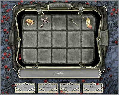 Now you will have to combine two items from your inventory. Start off by opening it. Click on the matches and drag them to an icon of a lantern. You will end up having a lit lantern. Now you will have to combine the lantern with a shovel which you have found in the shed. Choose this new object and close the inventory.