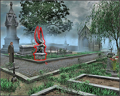 Your next task will be to solve four riddles. All the puzzles are connected to angel statues which can be found throughout this entire area. The first statue of an angel is on your right, so you'll only have to go there (screen). Click on an angel and wait for the game to display a new screen. Read the inscription and familiarize yourself with a clue on how to solve this problem.