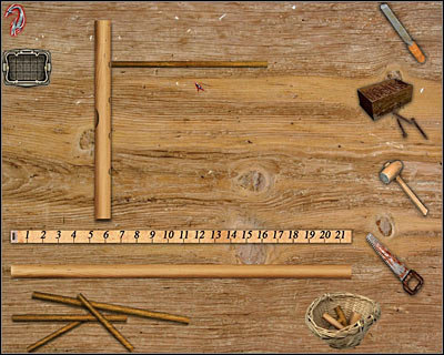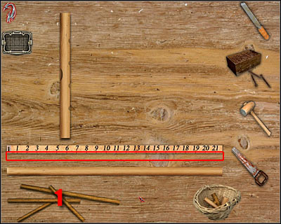 Now you will have to pick up a saw (last item on the list of tools). Make the cut directly under the 10-centimeter mark, because that's how deep the first hole was. Once this is done, pick up this piece of wood once again and place it in the main area of the workbench (screen). It'll occupy the first slot from the top.