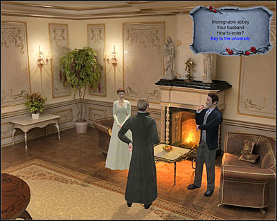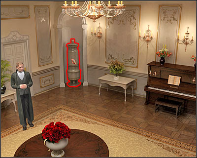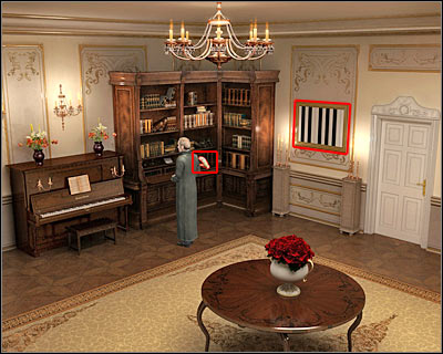You're standing inside a fairly small room, however you will be allowed to move around to explore it a little. I would recommend that you take your time, especially since you aren't rushed by anyone nor anything. Start off by choosing a passageway located next to Seward. Look at the flowers and try using the left door. Van Helsing decides that it's best not to disturb Mina while she's resting. Click on a small object in the corner of the room (screen). You will notice that there's a safe here, however you can't open it at the moment. Look at the piano which can be found to your right.