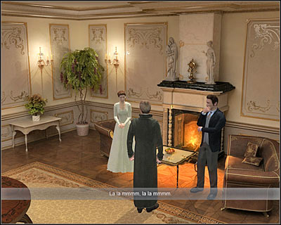 Go to the right and you'll go back to where other characters are standing. Try talking to Madam Orlowski. As soon as you've started this conversation, you'll notice that she's humming some kind of a melody (screen). Obviously you will have to choose some of the new topics from the list. Ask her about the painting, about the strangle melody and about the safe you've encountered before. End this conversation and notice that you've received a new report - Duchess Orlowski's Song. Examine the notes, because this is one of the clues for an upcoming puzzle.