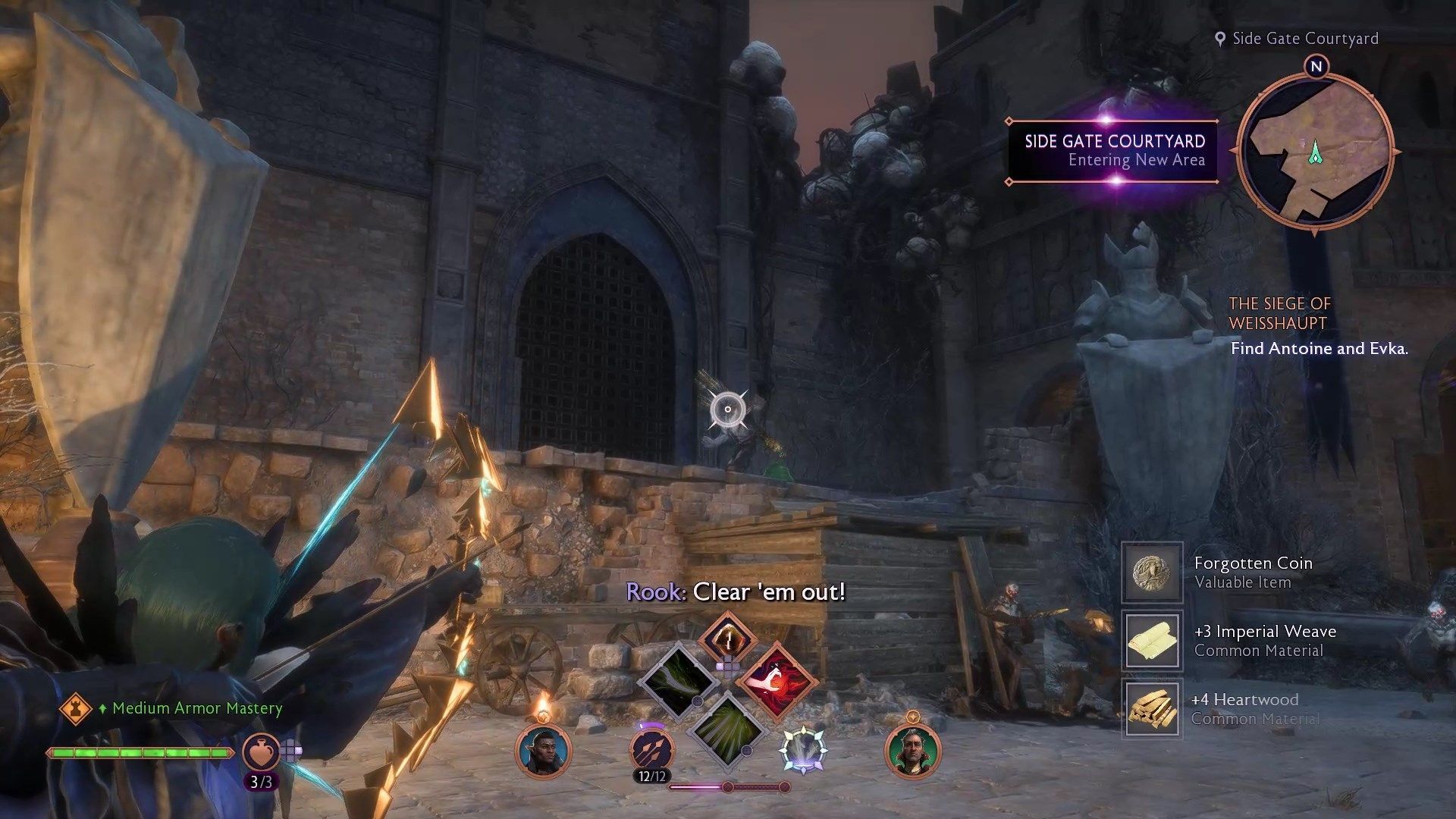 You will begin the quest in the Weisshaupt courtyard, where you will immediately begin fighting a horde of Darkspawn. The main threats in almost every fight will be armored enemies wielding axes and distant enemies throwing spears. It may be a good idea to push through enemy lines to get rid of spearmen, whose projectiles can be easily overlooked in the heat of battle.