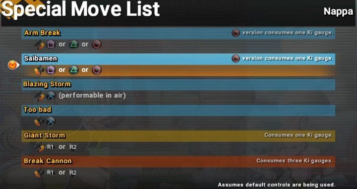 - Break Cannon - Nappa attacks with all of his power and then shoots a powerful projectile that deals massive damage.