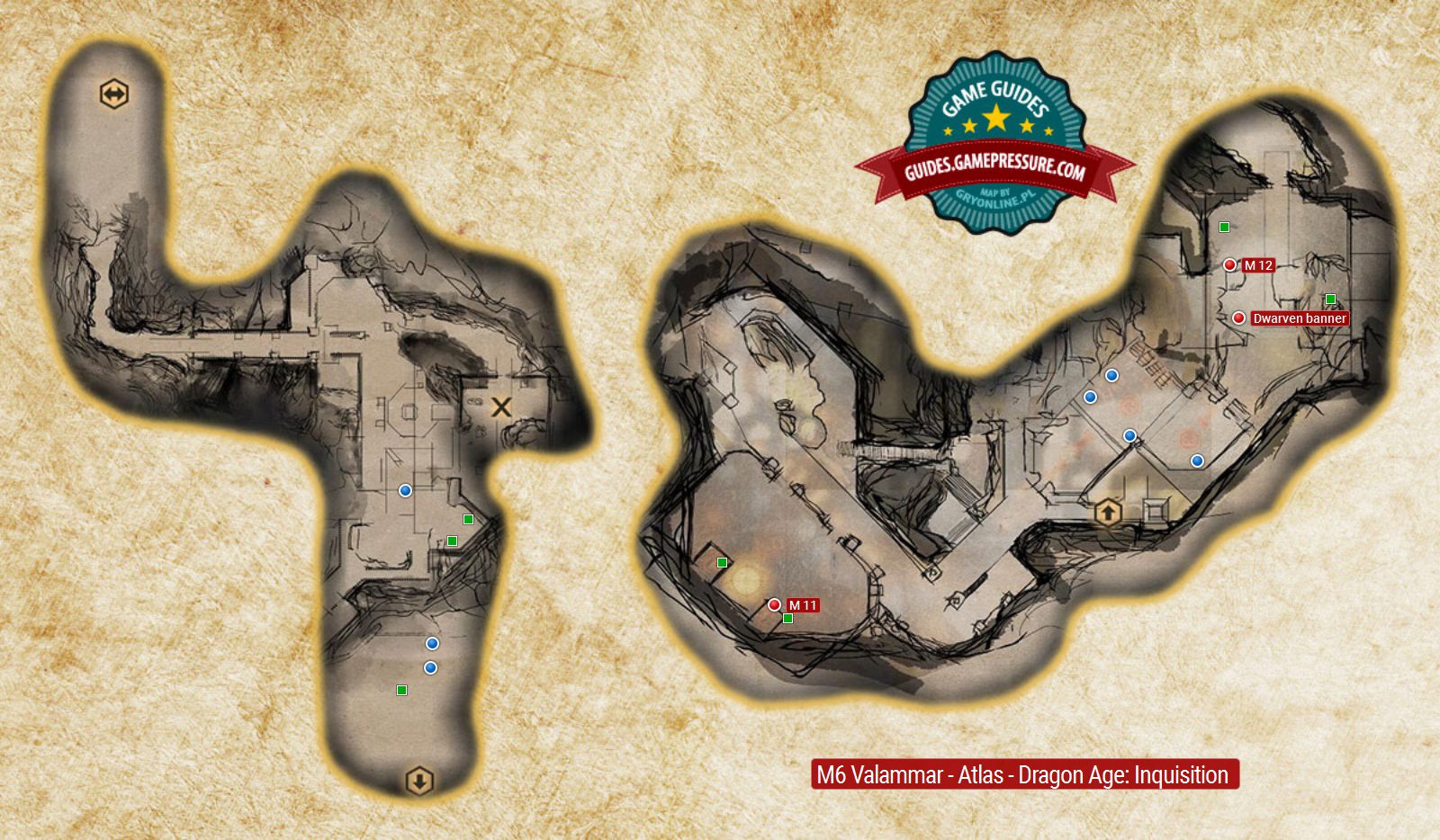 Above, you can see the map of the Valammar area. It is a medium-sized underground location, which you can enter after you find the key in the Hinterlands and reach the hidden door behind the waterfall (to learn more, see the Hidden locations page). You explore Valammar while completing the " Deep Trouble" side quest and it is worth knowing that you encounter many opponents in this location (members of the cartel and Darkspawns, among others). Also, you can collect numerous items here and the most important ones are in the large treasure.