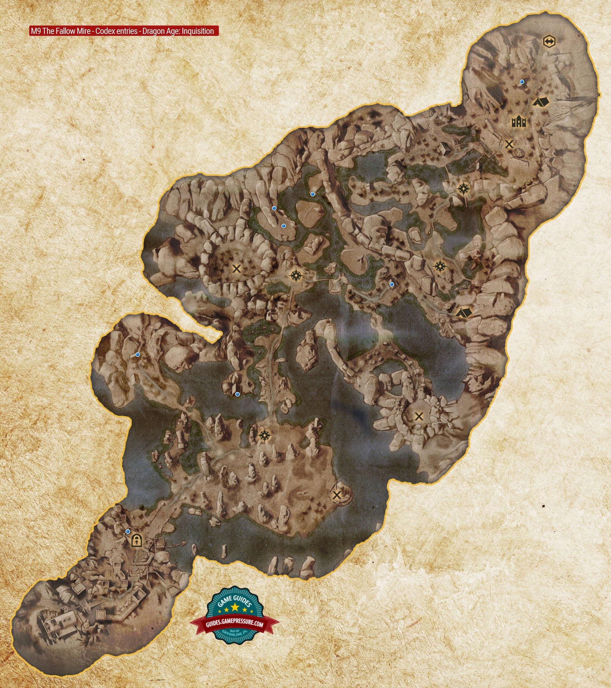 The above map presents locations, where you obtain new codex entries in The Fallow Mire. Since there are no caves in the location, nor dungeons, all of the objects, all of the entries-related objects are exposed. Keep an eye out for notes, letters, books and such. You may only have problems reaching one of the entries at the fort - it is behind a locked door that can only be opened by a well-trained rogue.