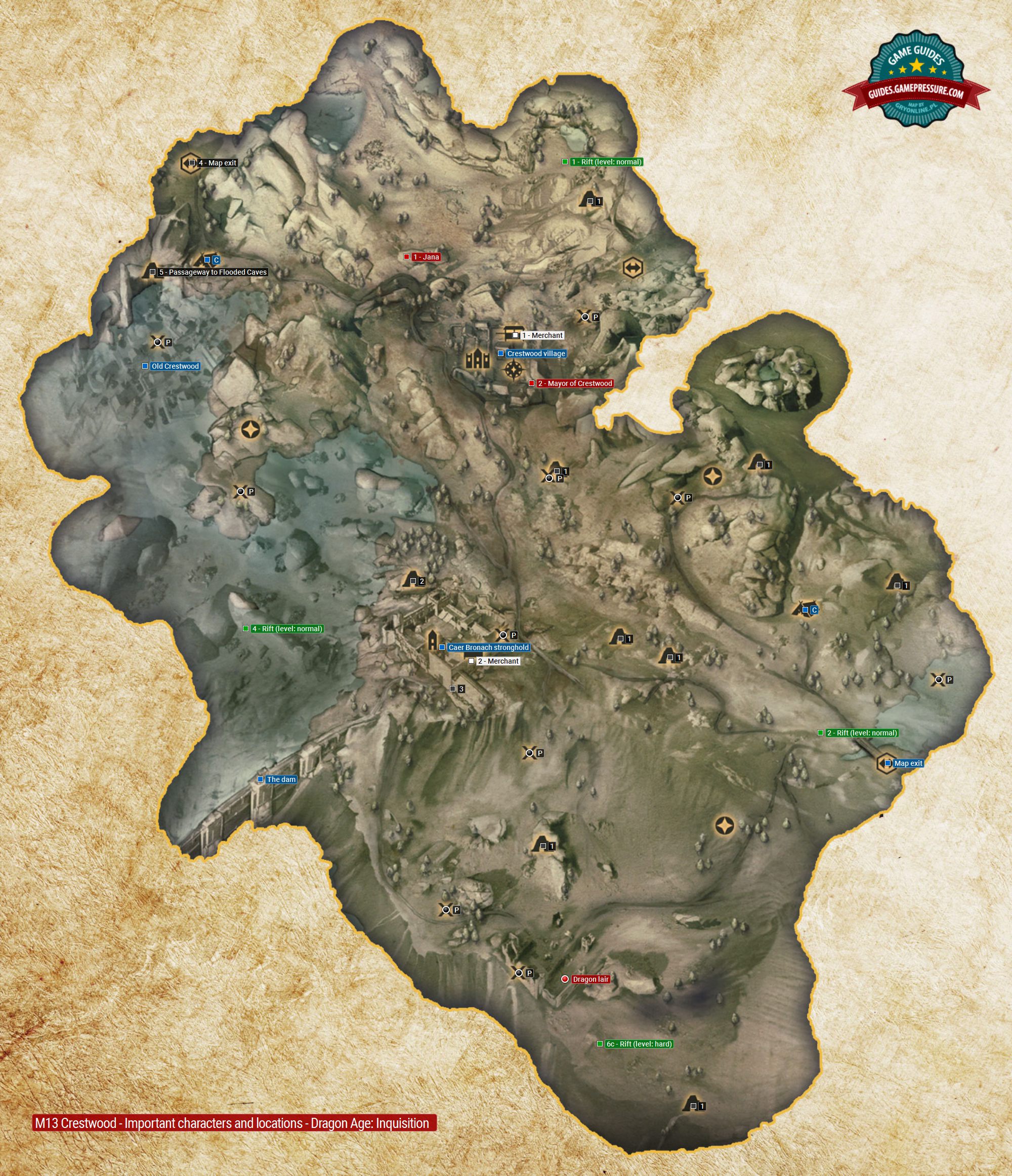 The above map presents all of the important characters and locations in Crestwood. You can encounter friendly characters in the Crestwood village, among others, located in the central part of the map. Allies also appear in Caer Bronach, after you recapture it from the bandits and you will find, e.g. a trader among them. Apart from the two locations mentioned above, there aren't too many areas to explore here. You can visit the dam, the Old Crestwood (only after you lower the water level in the lake) and a number of caves. Just like usually, you can find campsites and landmarks here.