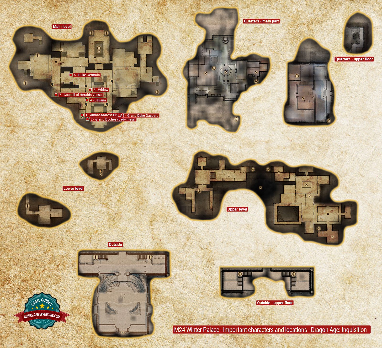 The above map presents important characters and locations in The Winter Palace. There are a lot of NPC characters in this location. The main character can talk to most of them and sometimes it's required to move on with the main quest. It's worth mentioning that some of the characters are constantly on the move so don't worry if you won't find them after getting to the area displayed on the map. Take some time to look for them.