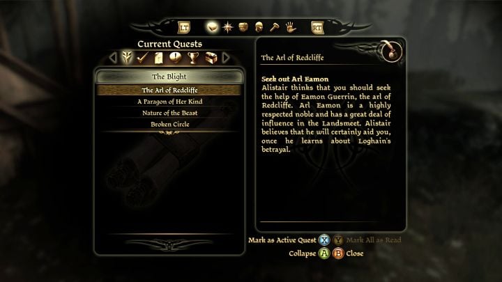 The overarching objective, as Grey Wardens, will be to unite various races and factions of Ferelden in the fight against the Blight. Convincing each group is the theme of a separate story quest in your journal.
