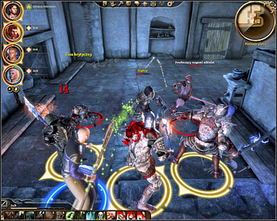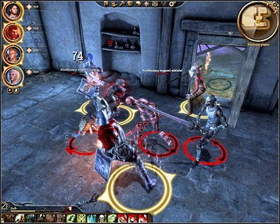 Make a few steps forward and you're going to be attacked by a large group of skeletons. I would recommend staying somewhere near the main gate instead of moving left or towards the stairs seen in the distance, so you won't be fighting more than one group at a time. Thankfully eliminating the undead is going to be a relatively easy challenge, aside from having to deal with one acolyte. Don't forget to protect your mage against enemy attacks, but I'm sure that you'll manage the situation.