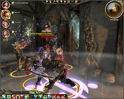 Click on the door and choose the second option from the list (the one involving Gaxhang). Doing this will allow you to enter [Denerim - Dirty back alley - Old hut]. Here you'll have a short conversation after which you'll trigger a boss battle with Gaxkang the Rampant. As soon as you've started the duel move back, so you won't have to keep standing in a narrow passageway. Don't forget to heal your team members frequently, especially since Gaxkang's spells are going to be very powerful. Once you've won examine the body of the creature to find an excellent sword (Howling blade) and open a nearby chest to collect wonderful gauntlets (Elementalist's grip) among other interesting things.