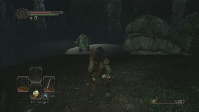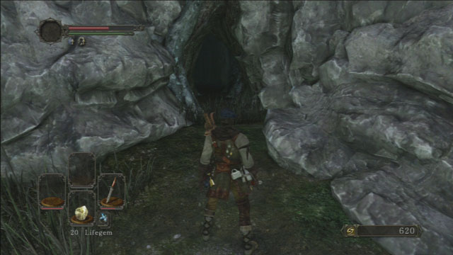 At the very beginning, go upstairs and collect the Human Effigy. Then, walk through the door, into another location, where you will find a soul and a torch, behind the cart. You can also start your first campfire here. Keep going ahead and, once you go past the tunnel, walk through the mist on the left. As you go deeper into the cave, you will encounter two opponents. They are relatively weak, block the first strike and attack yourself. Of course, try to lure them to you one-by-one. Several steps ahead, you should be especially careful, because there is another enemy around the corner.