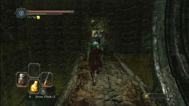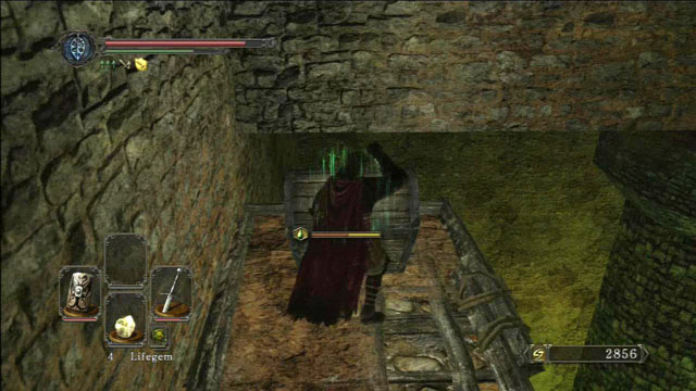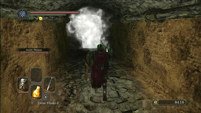 Go back to the balcony and run on its far end. Flip the lever located on the wall to lift an elevator, below which you will find a soul and a Divine Blessing. Use the elevator to reach the top and collect a Mirrah Shield from a chest. Go back down, climb the ladder to reach the upper level and run along the corridor. Turn right halfway through it and go down the stairs, to speak with Jester Thomas. Go back into the corridor and continue along it, until you reach its end. An encounter with a knight wielding a magical spear awaits you here. Get rid of him, go a little further and kill another group of two knights an two witches - the witches are fragile, but they have a powerful fire attack at their disposal.