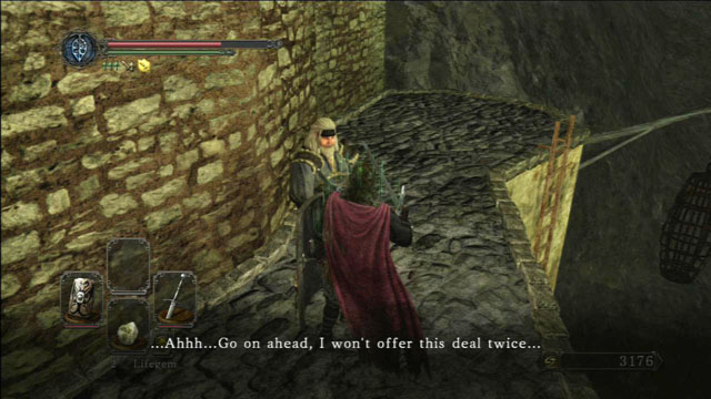 Go upstairs and on the balcony, where you will be attacked by yet another enemy. Destroy the wooden railing and go along the edge of the wall on the right, to collect a Simpleton's Spice. By going to the opposite direction, you will reach the Laddersmith Gilligan. After speaking with him, by contributing 2,000 souls, he will set up a ladder for you, allowing you to go on the lower lever to collect a Pharros Lockstone and a Twinkling Titanite. After exhausting all the dialogue options, he will transfer to Majula.