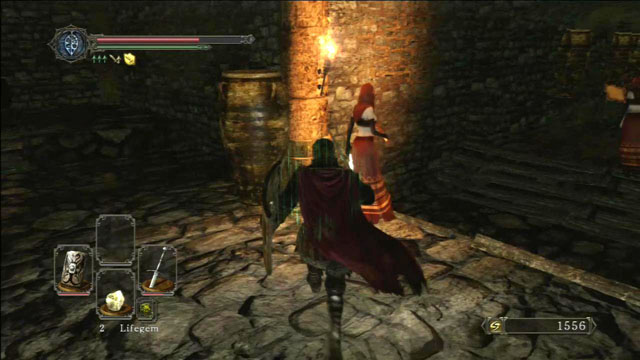Exit the room with the bonfire and climb yet another staircase, where you will encounter two warriors. Block their attacks and launch your counterattacks when they are preparing for another move. There's a giant with a warhammer hidden behind a bowl hanging from the roof - defeat him and collect a Radiant Lifegem, located inside the corpse by the wall.