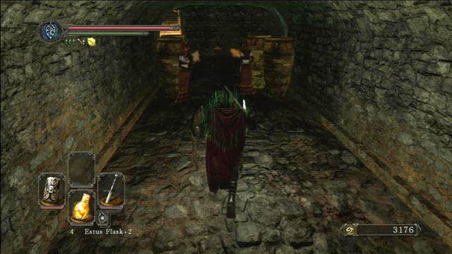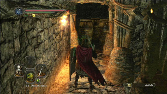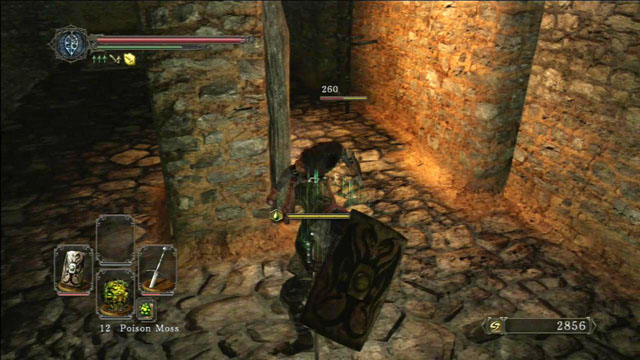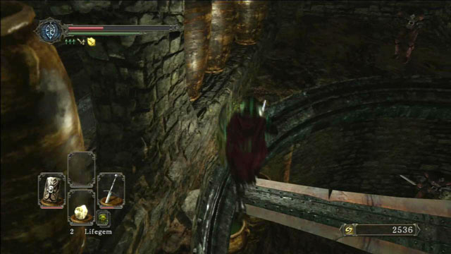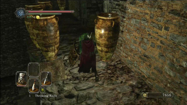 Climb up another staircase, where you will have two paths available. After going to the right, use your throwing knives or bombs to destroy the vases from afar. Inside, there's a bunch of poisonous fungi. You can also see a chest there - restrain from opening it, as it's a Mimic. Stand behind the chest and start attacking it with your sword - try to land as many strikes as possible, before the chest transforms into a monster. After killing it, collect Dark Gauntlets and a Work Hook. There's also a place to use your Pharros Lockstone here, but you will just be flooded with poison if you do so.