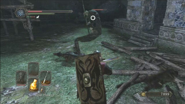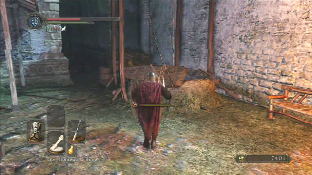 After returning to the bonfire, exit the cell and climb up the stairs. You will stumble upon a white knight on the stone bridge. You don't need to fight him if you don't want to - unless you attack him first, he will leave you alone. On the edge of the bridge you will see a couple of barrels. Destroy them to be able to attack the enemy standing on a platform, below you - all you have to do is to stand on the edge and jump down, attacking in the process. Fighting him may be a little tricky, as he uses a weapon with a longer reach, but by using a suitable tactic, you should be able to handle him. You can either attack by blocking his attacks and counterattacking when he's staggered, or by dodging and attacking his exposed back. Also, keep in mind that a couple of dogs will join the fight as soon as you hit the ground. Destroy the wooden scaffolding drop down an item.