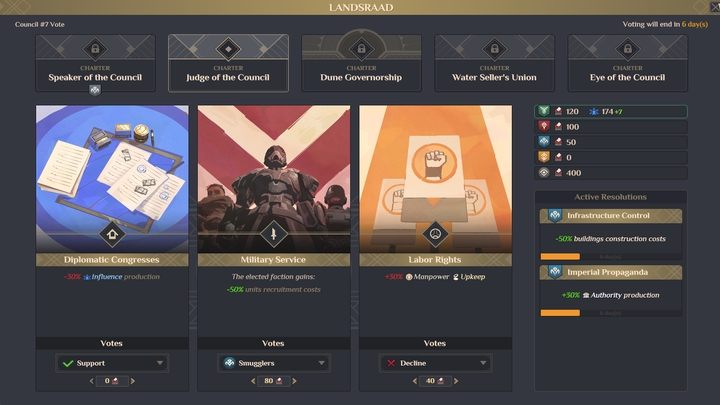 None of the Arrakis factions is independent: they are all under the reach and rule of the Empire. Hence the political gathering - Landsraad, which gathers monthly to vote on bills. All factions take part in these votings, but also the inhabitants of the planet, who have the overwhelming majority of votes (400). Each faction may or may not vote for one or more resolutions, which are announced before the vote. The Landsraad window gets unlocked after the first month of the game.