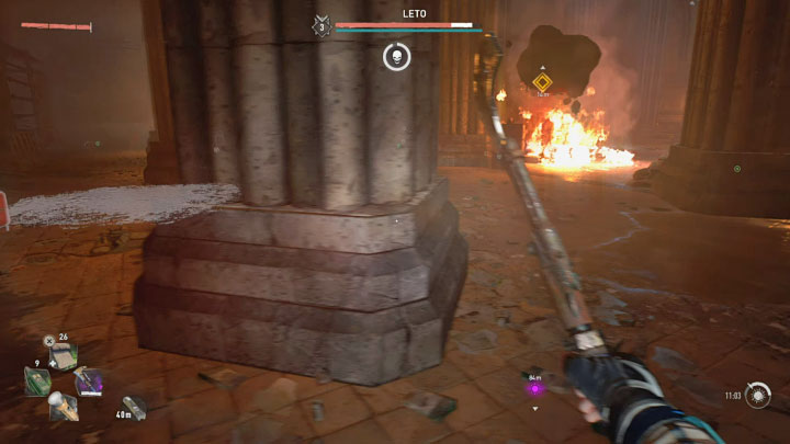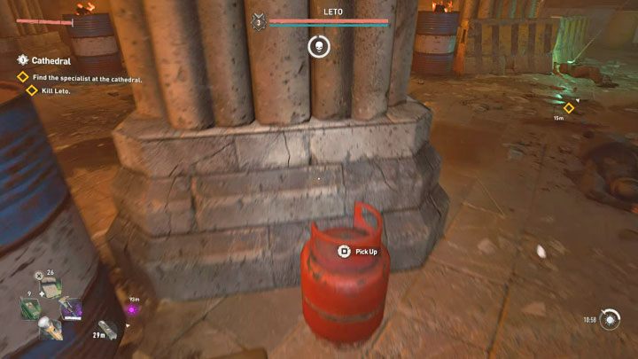 - Red tanks - you can set them on fire and throw them at the boss or detonate them from a distance with ranged attacks when Leto gets close to them.