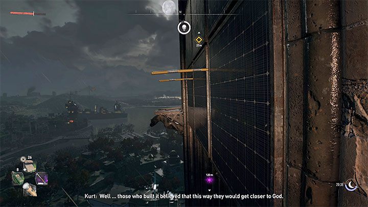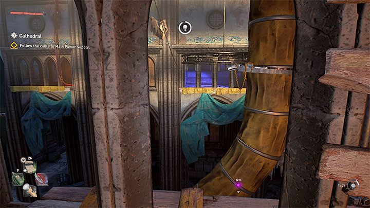 Look for a scaffolding at the base of the cathedral. You can jump to the subsequent platforms and ledges marked with yellow until you reach a shutter which will let you enter the cathedral.