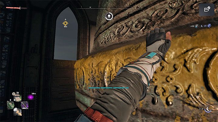 As you keep climbing you'll have to jump towards protruding gargoyles and grab onto some more bars. There's an interactive box on the roof - open it to get the blue module.