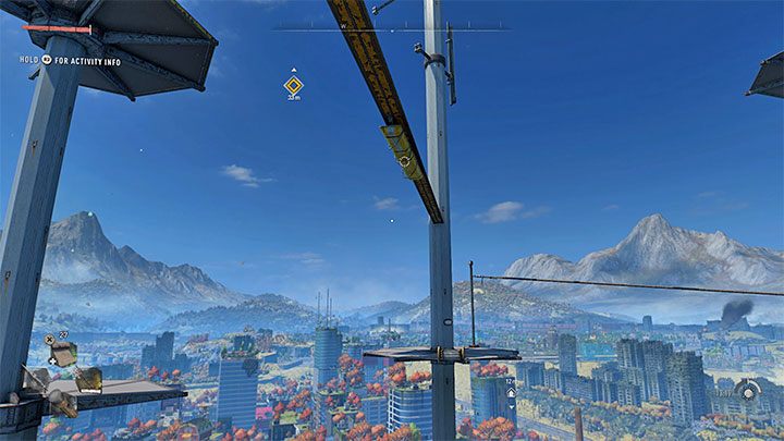 Your destination is in The Wharf district. It's a radio tower antenna on a skyscraper's roof. Unfortunately for you, this means a long climb. You can't use the paraglider to land on the rooftop, as the antenna is on the tallest building in the area.