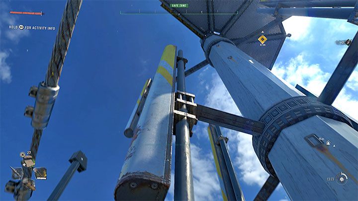 Go down a zipline. In the next section some vertical elements move, forcing you to grab onto the subsequent ones at the right moment - face them and wait for the perfect time to press the jump button. Do not climb too slowly though, you may run out of stamina and fall.