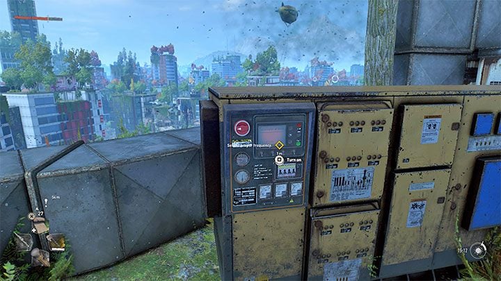 During the upper part of the climb once again use the grappling hook to reach a distant round balcony. Finish your climb to the top and open the box. You must also use the switch next to the box to set the correct frequency.